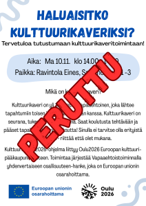 Haluaisitko kulttuurikaveriksi Tervetuloa tutustumaan kulttuurikaveritoimintaan! Aika Maanantai 10.11. klo 14 – 14.30 Paikka Ravintola Eines, Kajaanin työvoimayhdistys Mikä on kulttuurikaveri Kult